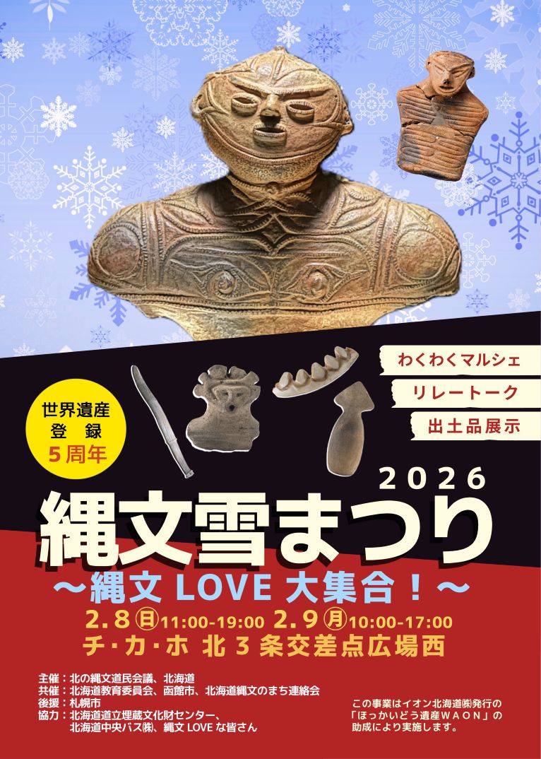 縄文雪まつり~縄文LOVE大集合~開催決定☃縄文雪まつり~縄文LOVE大集合~開催決定☃ 2026.1.9 お知らせ 縄文世界遺産推進室 札幌市地下歩行空間でさっぽろ雪まつり期間に開催している「縄文雪まつり」が今年も開催(2月8日~9日)することが決まりました。 出土品展示やリレートーク、マルシェ・PRブースなど盛りだくさん!詳細はチラシをご覧下さい。 一覧に戻る