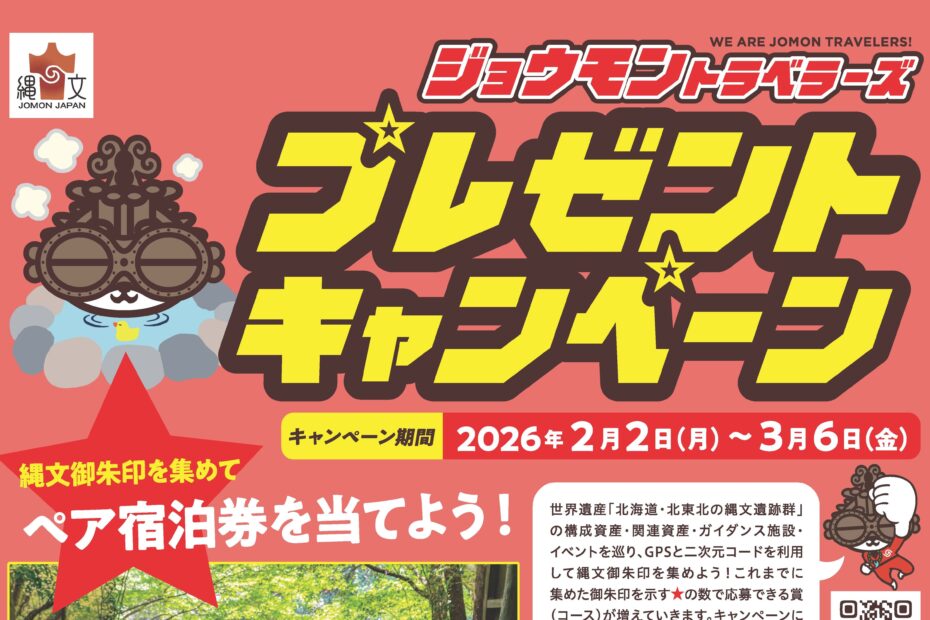 令和7年7月25日から開催中の「北海道・北東北の縄文遺跡群」御朱印企画「ジョウモントラベラーズ」において、ペア宿泊券などの豪華賞品が抽選で当たるプレゼントキャンペーンを開催します!