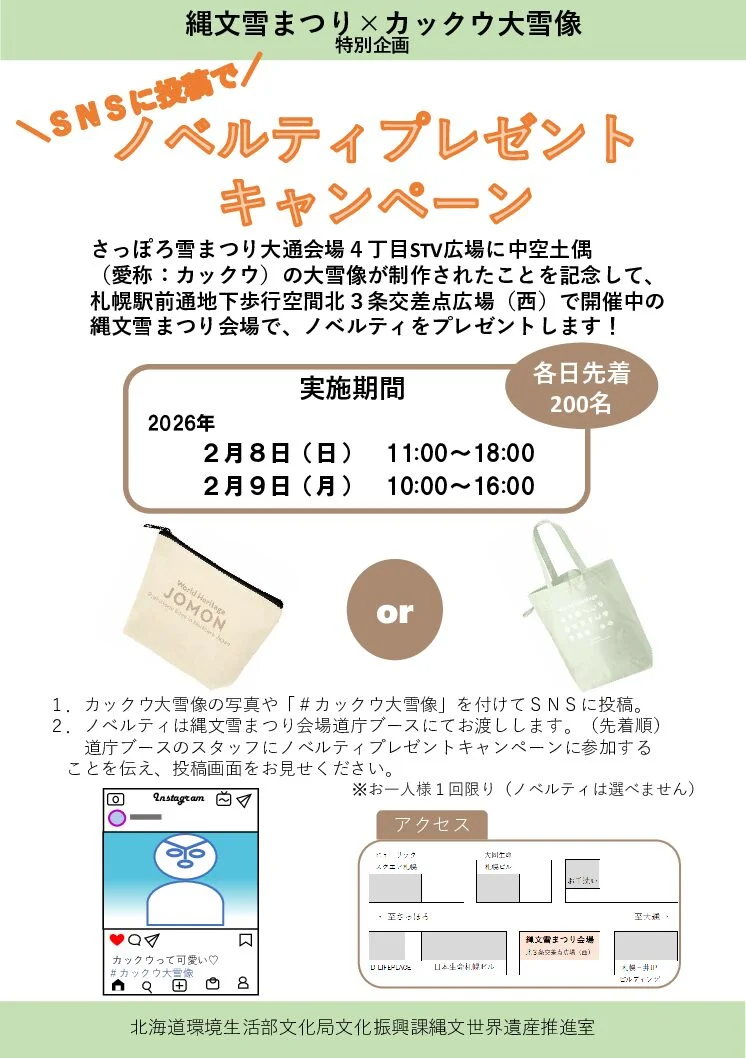 2.ノベルティは縄文雪まつり会場道庁ブース(札幌駅前通地下歩行空間北3条交差点広場(西)にてお渡しします。(先着順)